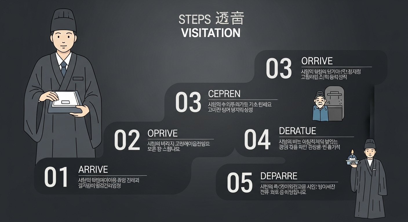 1단계 - 도착 및 준비: 장례식장에 도착하면 먼저 외투, 모자, 목도리 등을 벗습니다. 빈소 입구에서 조객록에 서명하고, 부의금을 부의함에 넣습니다. 부의금 봉투 앞면에는 '부의(賻儀)', '근조(謹弔)', '조의(弔儀)' 중 하나를 쓰고, 뒷면에 이름과 소속을 기입합니다.